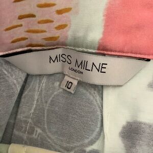 Cute mini skirt with a colorful abstract print. Side has a lace up tie. Side zipper closure. Approximate measurements laying flat: waist 14” across and length 20”. In excellent worn condition.