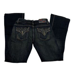 These denim jeans feature a sleek dark wash with rhinestone-embellished back pockets, offering both durability and style for casual or semi-formal wear.