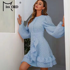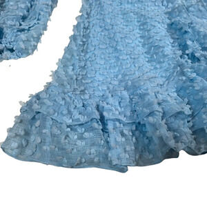Add a touch of elegance to your wardrobe with this stunning Miss Ord Light Blue Ruffle Mini Dress in size M. Crafted with delicate textured fabric and a whimsical design, this dress features lantern sleeves, a flattering high-waist fit, and cascading ruffle details for a truly feminine look. Perfect for weddings, parties, or any special occasion where you want to stand out effortlessly.