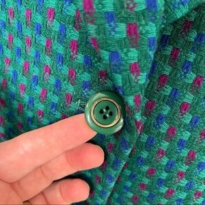 Miss Pendelton Vintage Green Wool Suit Set in excellent vintage condition. Gently worn with no flaws. Skirt and one button Blazer with pockets. Both pieces are green with little bits of blue and pink. Lined. No stretch.