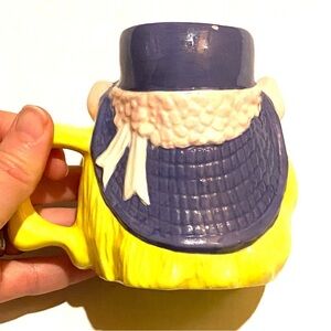 Miss Piggy Muppet Painted Ceramic Mug Coffee Cup. Yellow and Purple. Molded Handle. Measurements in Pics. GUC, a few paint chips around top.