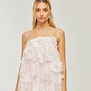 A romantic, feminine mini dress with delicate floral detailing and subtle crystal embellishments. The silhouette is softly structured with a flattering fit-and-flare shape, giving that elevated, modern-Parisian look similar to Reformation and Sandro. Perfect for spring events, date nights, and special occasions.