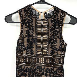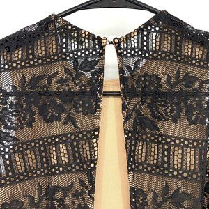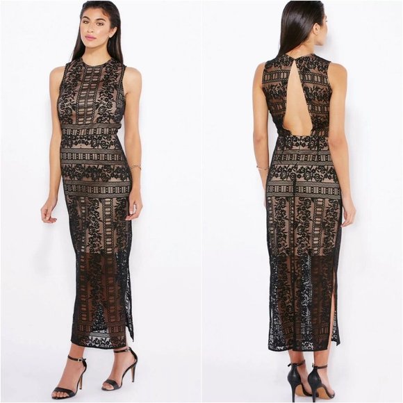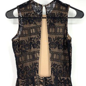 Miss Selfridge Maxi Dress Womens Size 2 Black Nude Tan Floral Lace Sleeveless Open Back. Great preowned condition. Back zipper. Keyhole back with hook/clasp closure. Inside lining.