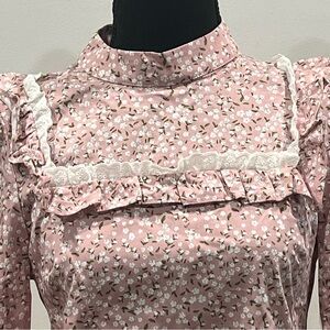 This elegant pink blouse from Miss Selfridge features a charming bib collar and ruffled details, offering a fitted silhouette. The blouse is designed with a soft, velvety texture and subtle floral patterns, making it a stylish choice for any occasion.