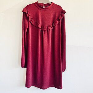 Red / burgundy ruffle bib smock long sleeve mini dress