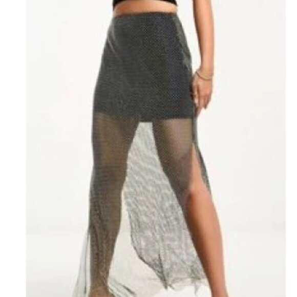 Miss Selfridge black diamante/beads mesh goth maxi skirt size 14