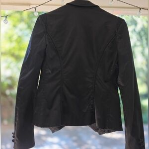 Elegant black blazer, peaked tail in the front, satin fabric, worn 2 times. Beautiful jacket to be paired with jeans or slacks