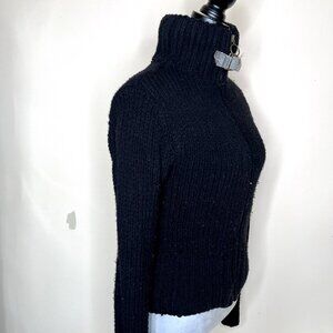 Incredibly soft, warm and cozy! Thick chunky wool blend black knit sweater with black & grey fake fur interior. Sleeves are not lined. Zips up the front into a high neck with a strap. Has a decent amount of stretch. Extremely warm. Made in Italy.
