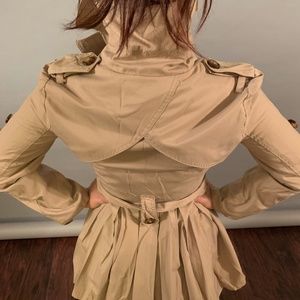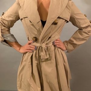 Miss Sixty Khaki Lightweight Tan Trench Coat. Perfect for layering and has contrast pinstripe print when worn rolled up. Back pleat details, brown horned buttons. Used once for photo shoot. In new condition. Smoke-free production studio and selling gently used samples from our library used on photo shoots.