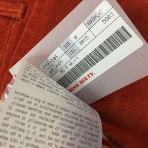 Color: rust orange with purple blue, orange, green flowers. "Miss Sixty" embroidered on back.