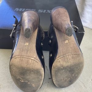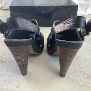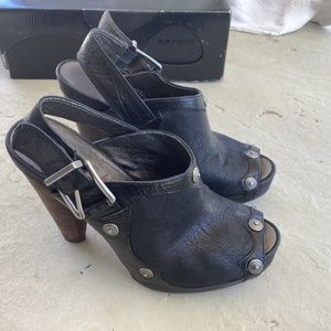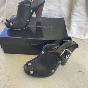 Beautiful black leather sling back with silver grommet detail. 5” heel and 1” platform