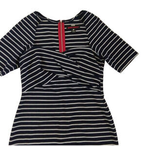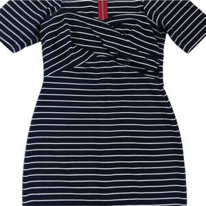 Vintage y2K Miss Sixty striped wiggle dress in Navy blue and white with criss cross sweetheart neckline, size 8. Heavy weight jersey knit cotton spandex blend. In gently preowned condition, no flaws noted.