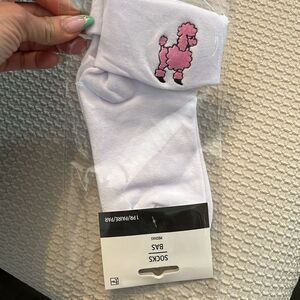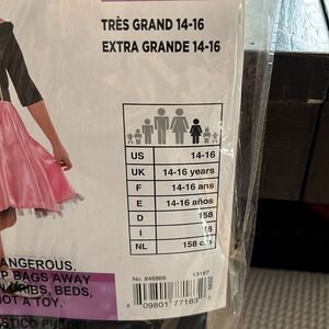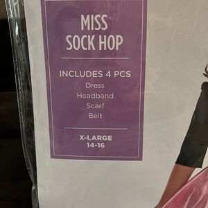 Step back in time with the Miss Sock Hop Kids Costume. This charming outfit features a pink skirt with a classic poodle design and a stylish black top. Perfect for themed parties and dress-up fun. Comes with all in the package. Socks is one size fits most