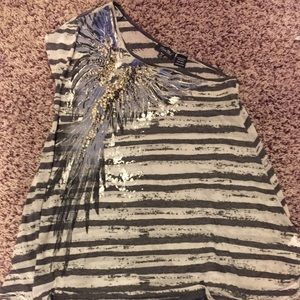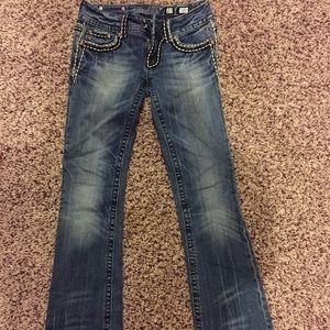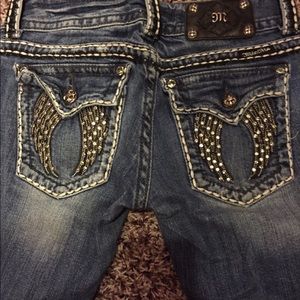 The jeans are in perfect condition all jewels are in place and they look brand new. The shirt is in great condition and has been barely worn