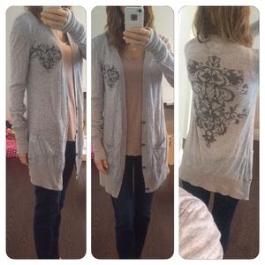 Miss me sweater, size small. Seam by shoulder is coming loose and there is a repaired hole by label on back, both shown in pictures