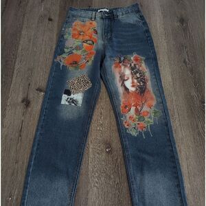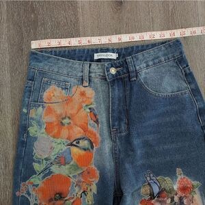MissLook Women's Jeans Painted Floral Bird Fairy Raw Hem Small Blue
