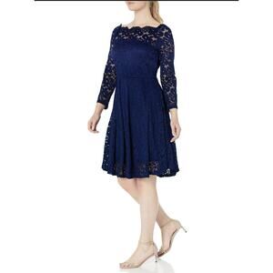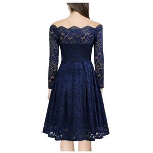 MissMay Women’s Retro Floral Lace Swing Dress in Navy Blue, Size Small. Sheer Overlay, Long Sleeves, Flattering Square Neckline With Scalloped Lace Trim, Pleated Swing Skirt, Pullover Style, Made in China.