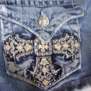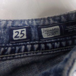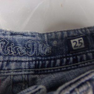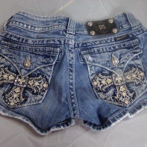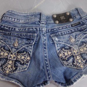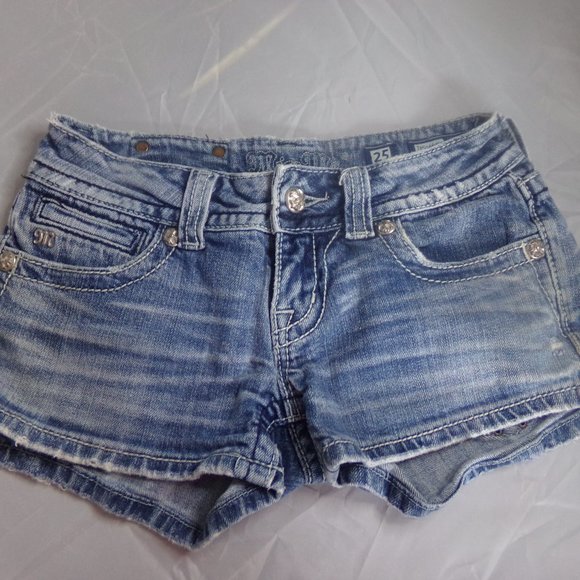 These Denim MissMe Shorts are in excellent condition. Faded Denim. Size 25. waist 30 Inseam 2 1/2 inches JP5046H10 Short Designed in USA. All studs and Logo Patches in tact. No flaws. Shorts for women and teens