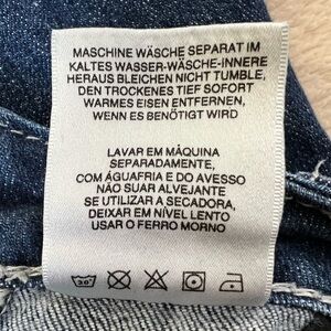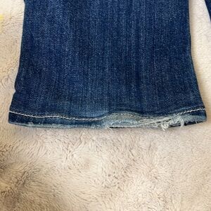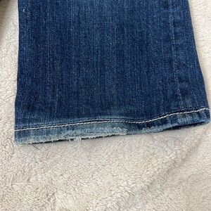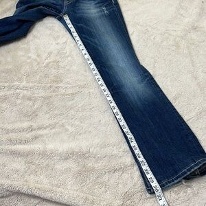 Mid-rise, dark wash boot cut denim. Back pocket features embroidered design with sequin and rhinestone rivet detailing. Black leather patch features embossed cross design with M logo. Pre-owned with minor signs of wear. Hem on back of each leg is worn and missing one small stone of back packet. (See photos)
