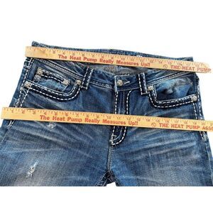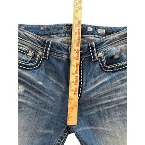 Chic and stylish Miss Me Jeans in size 26. Features beautiful embroidery and blue denim material embellished with rhinestones. Perfect for a casual and trendy look.