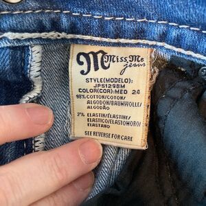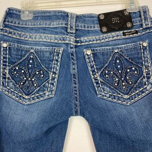 Chic blue jean shorts by Miss Me. Features embellished pockets. EUC no wear.cool minor distressing. Couple stones missing on left back pocket shown regular and in zoom. Not noticeable. Looks like NO Fleur de Lis. Western, coastal Cowgirl. All hardwear have brand emblem. Waist 14.75 rise is 9” inseam is 12”. Top to bottom 20”.