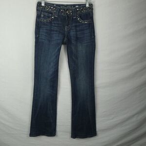 Medium wash, boot cut, with lots of studs and rhinestones. Five pockets. Size 26.