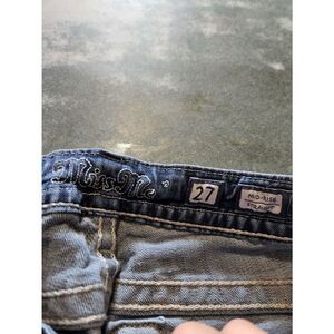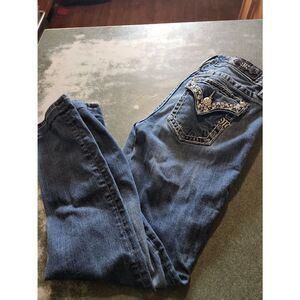 Miss Me midrise straight blingy pocket jeans sz 27x33.5 in good used condition with some wear as shown in the pictures.