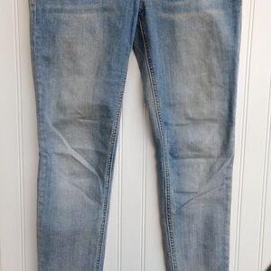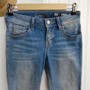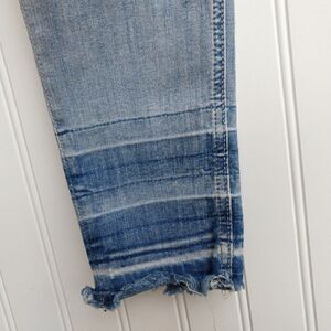 Miss Me light distressed wash ankle skinny jeans in raw drop hem, size 25. In gently preowned condition, no flaws noted.