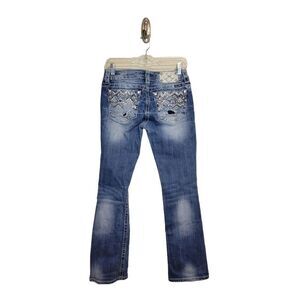 These are distressed regular wash denim with light wash denim down the front and back thighs Miss Me Signature Boot jeans with embellished back pockets and around the lining of the front pockets. These jeans measure 40 inches in length, 33 inches at the inseam, 14 inches at the waist, 18.5 inches at the hips, and 8 inches at the front rise. These jeans are preloved with a small stain and a small tear that are pictured.