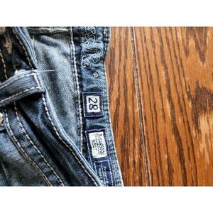 Miss Me fleur-de-lis pocket bootcut jeans sz 28x32 in good used condition with some wear as shown in the pictures.