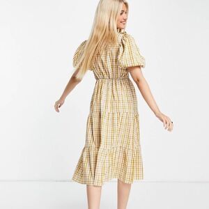 Yellow and white patterned check ruffle wrap dress midi US 6 Medium