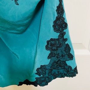 Beautiful emerald green camisole with black embroidered lace detail at the neckline and on the side. Perfect for summer! Can be dressed up or down. Like new, never worn, but was washed, no flaws. Please see photos for approximate measurements.