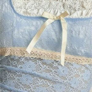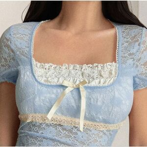 Misses Romantic Lace Short Sleeve Scoop Neck Casual Fitted Top with Bow In Blue