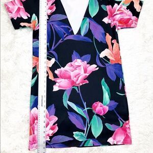 Super cute pre-owned Missguided Black Floral Short Sleeve Scuba Shift Dress Size US 6. No stains or holes. Please ask all questions before purchasing.
