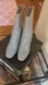 Sleek gray boots with a glossy finish. Features a stylish transparent heel. Perfect for modern fashion.