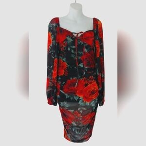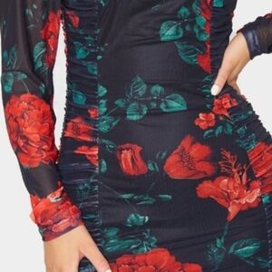 Missguided Dress Floral Ruched Cup Long Sleeve Body Con Valentine's Day