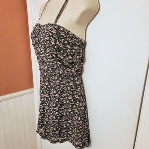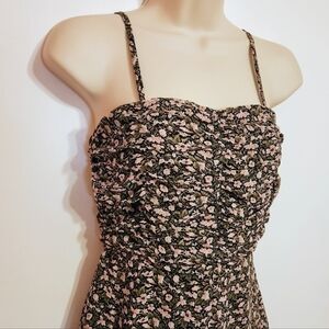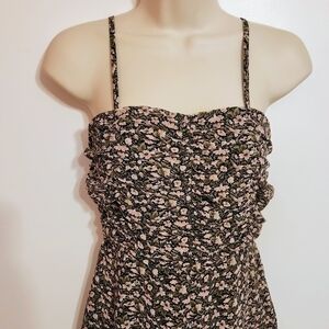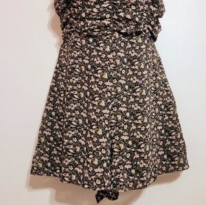 Missguided floral romper with spaghetti straps in olive green and pink, size 0. Features a ditsy floral print and shirred detailing on the top, front and back. One-piece short jumpsuit with the following features:
