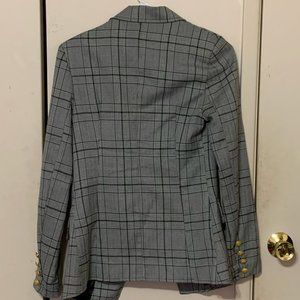 Grey blazer in a white check, gold military style buttons and long sleeves. Great condition!