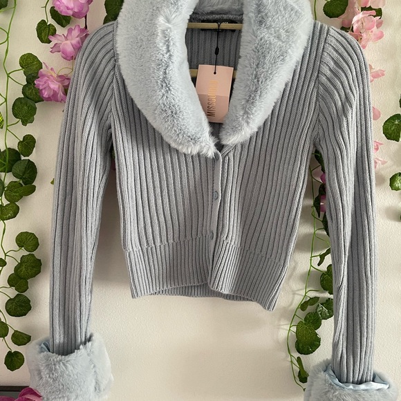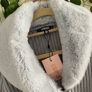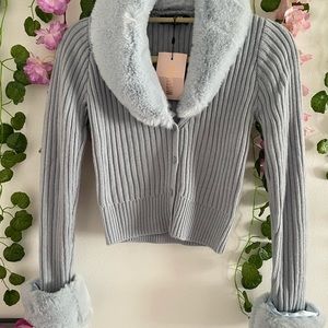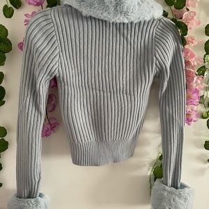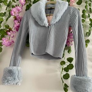 Stylish ribbed cardigan. Soft faux fur collar and cuffs. Perfect for layering.