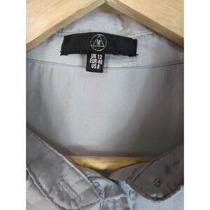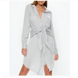 Missguided tie front dress with faux wrap bottom, functional button top and tie waist. Collar, button cuffs, satin texture/feel. Gray, size 8.