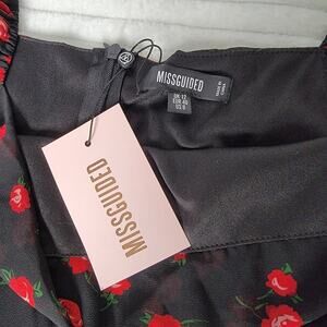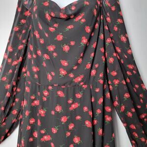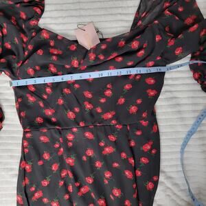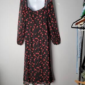 New with tags (NWT) Missguided women’s midi dress in a romantic black and red rose floral print. Features a sweetheart neckline, long sheer sleeves with elastic cuffs, and a flattering fitted waist that flows into a midi-length skirt.