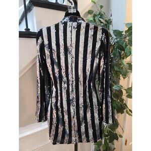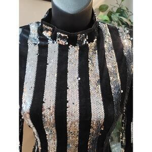 Missguided Petite women’s sequin mini dress in US size 2. Designed with eye-catching black and silver vertical stripes, this dress offers a sleek, figure-flattering silhouette. Featuring long sleeves and a high neckline, it’s perfect for cocktail parties, evening events, and special occasions where standout style is a must.