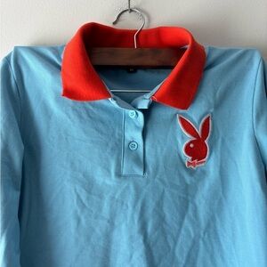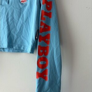 Great conditions Missguided Playboy crop top. No stains, rips or bad odor. Color blue and orange. Long sleeve. Has a collar neck. Buttons up. Great to pair with jeans. Please see pictures for more details.