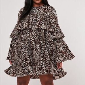 Missguided Pleated Smock Leopard Print Bell Sleeve Mini Dress Sz 6 Tall