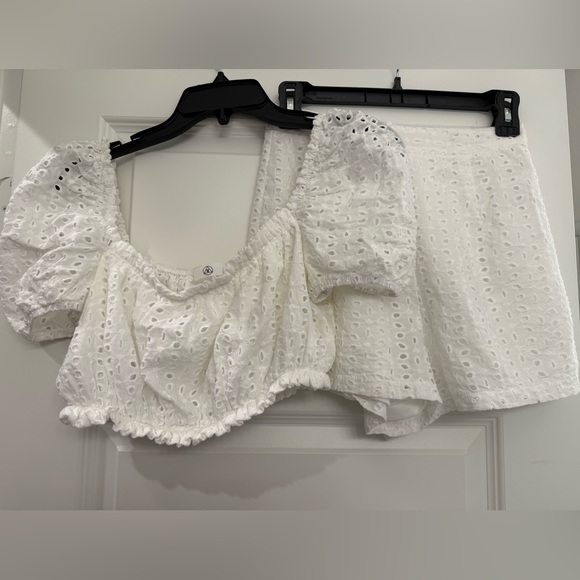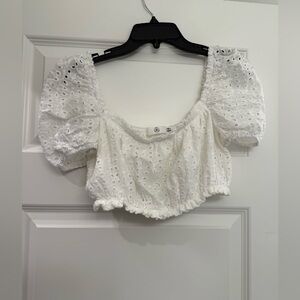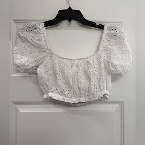 Chic and stylish white eyelet top with puff sleeves. Perfect for any occasion.