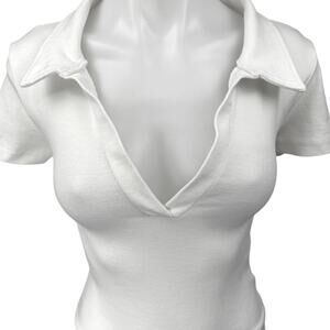 Missguided White Short Sleeve Collar V-Neck Cutout Tie Back Bodysuit Polo Shirt Top 6