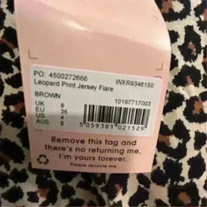 These Missguided pants are designed for women and feature a flared style in a brown animal print. Made from jersey material, they offer a regular fit with a mid-rise and a 33.5-inch inseam. The pants have an elastic waistband and a pull-on closure, making them ideal for casual occasions in the fall. They are machine washable for easy care. Size 4, regular size type, with a 20-inch waist. New with tags.