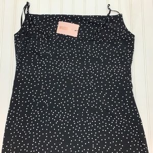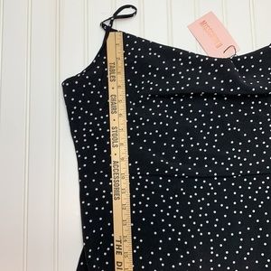 Missguided black polka dot, drape front dress NWT size 12. Spaghetti straps and side zipper. No flaws. See photos for approx measurements.
