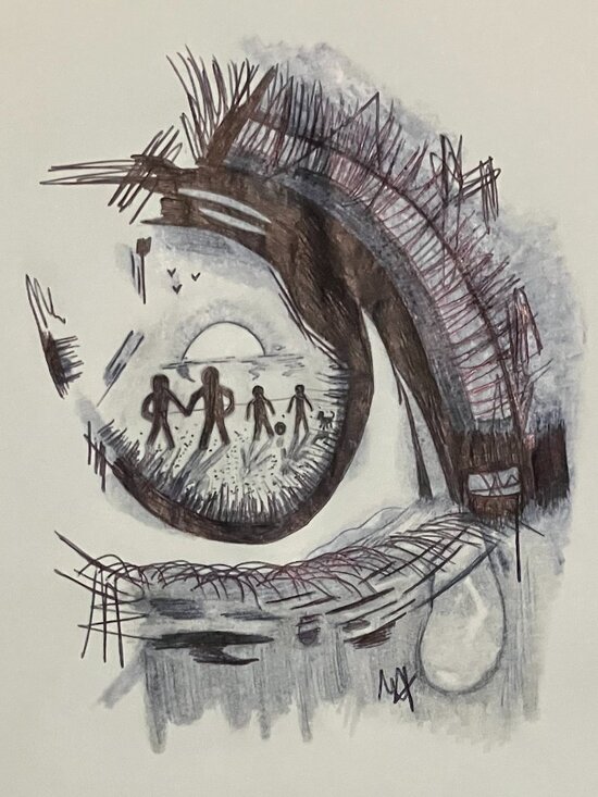 An ink and shaded drawing of a crying eye with a family in the reflection.