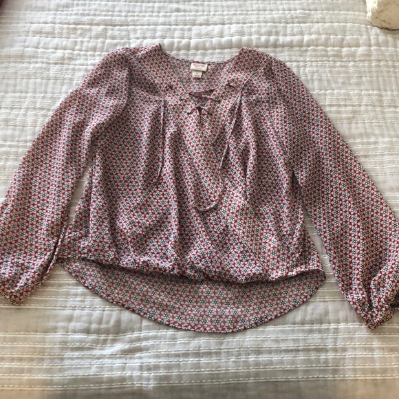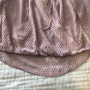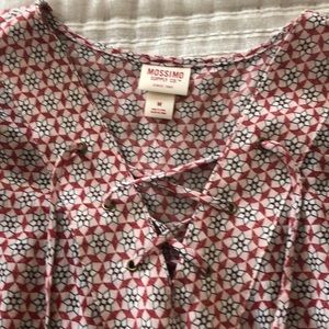 Lightweight pattern top, tie detail at the neckline. It is see-through would recommend bralette or tank underneath. Only worn a few times, no holes or stains!